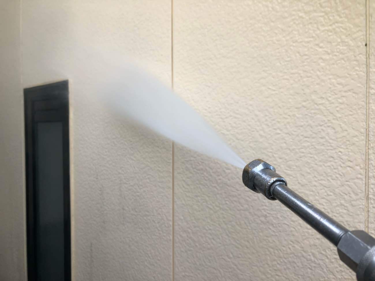 最初にホースの水で外壁全体を軽く流し、表面の汚れを落としておく
