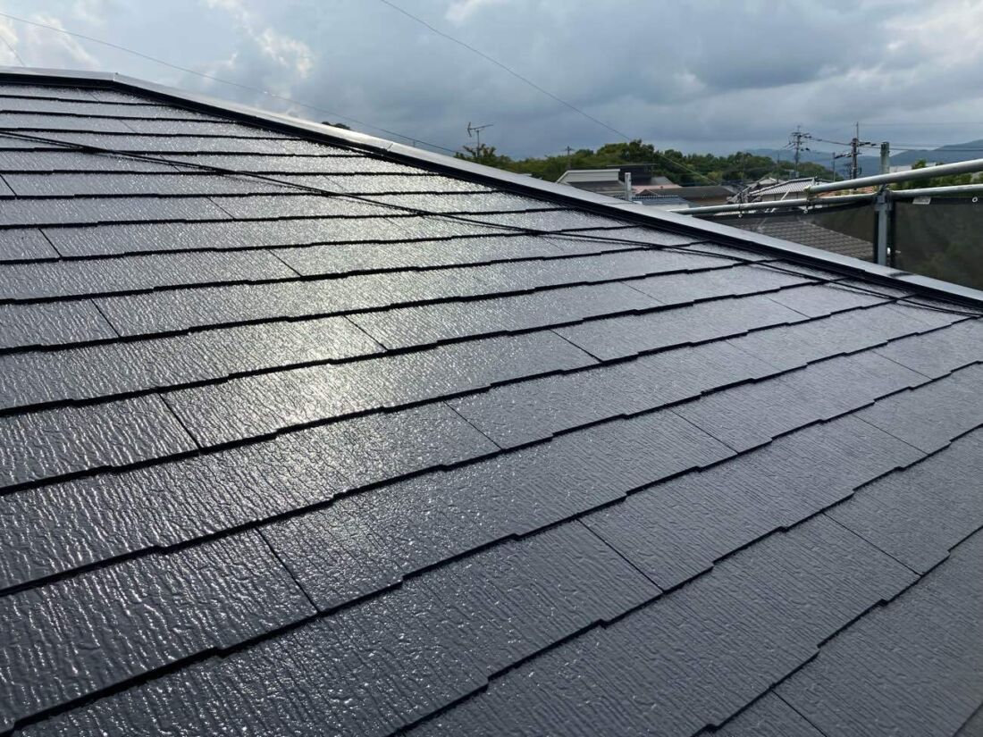 上塗りは、ムラを塞いで塗膜に厚みを付けて仕上がりのきれいな外壁塗装を実現します。屋根の耐久性と美観を高めます。【屋根】トップコート