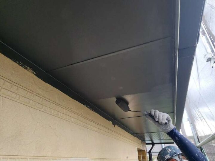 均等な厚みになるように塗装をおこないます。【軒天】上塗り2回目