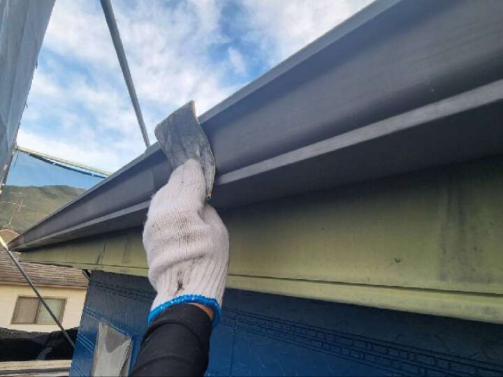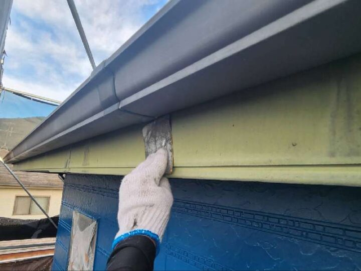 ケレン作業とは汚れと取り除き、微細な傷を入れることで、塗料の密着性を高めます。【軒樋】上塗り1回目