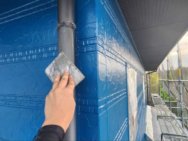 ケレン作業とは汚れと取り除き、微細な傷を入れることで、塗料の密着性を高めます。【竪樋】上塗り1回目