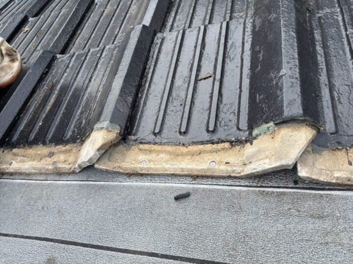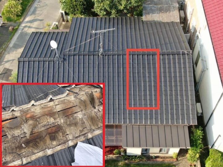 瓦を外してみると、ルーフィング(防水シート)が劣化しており、機能していない状態でした。