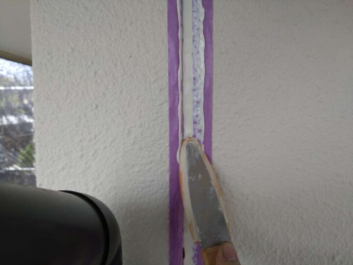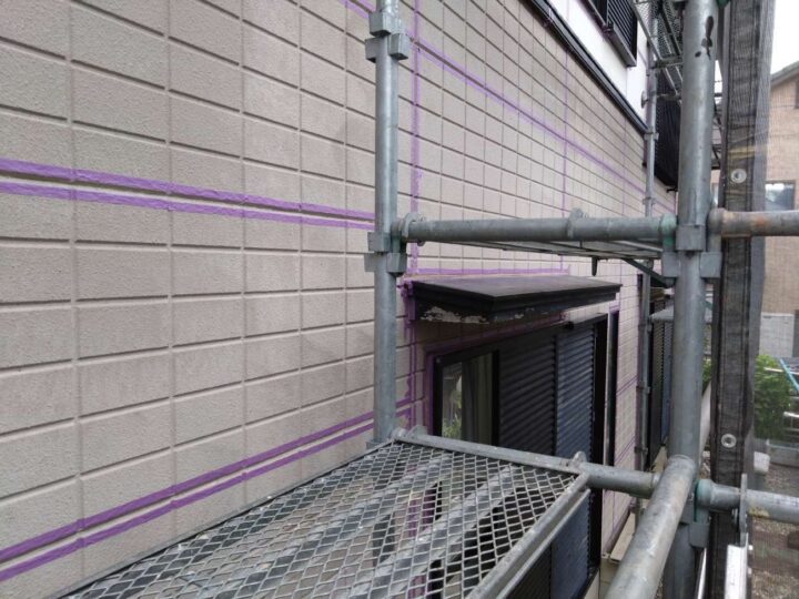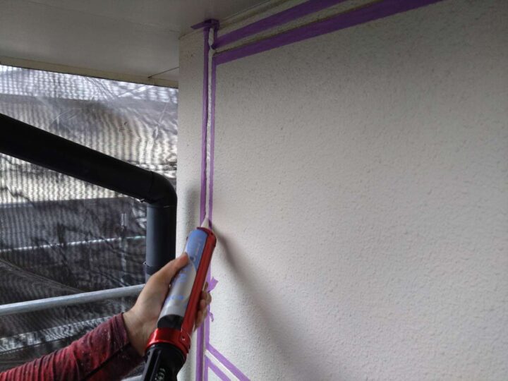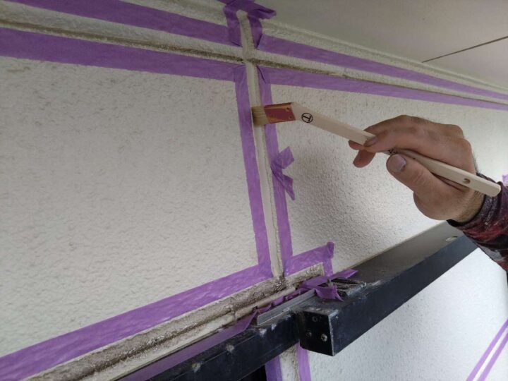 新しいシーリング材を埋め込む前に、古いシーリング材が埋め込まれていた部分を綺麗に掃除します。【外壁】養生テープ貼り