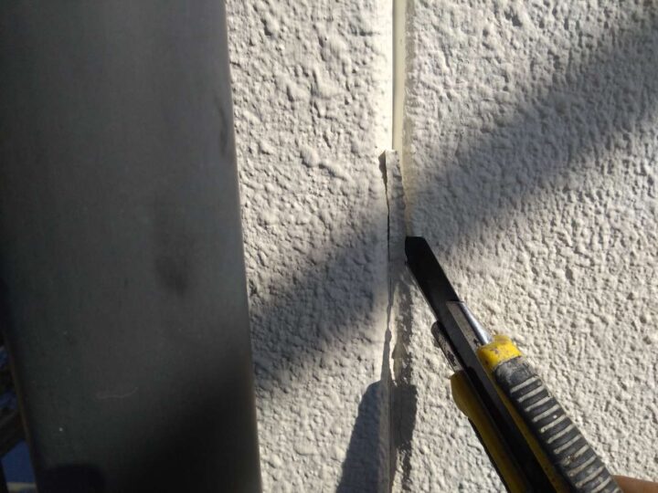 古くひび割れてしまった既存のシーリングをカッターなどを用いて撤去します。【外壁】清掃