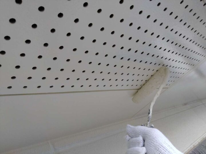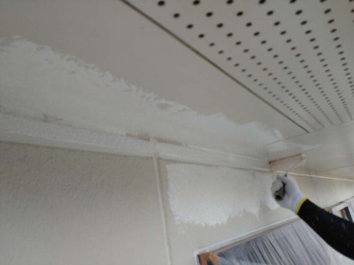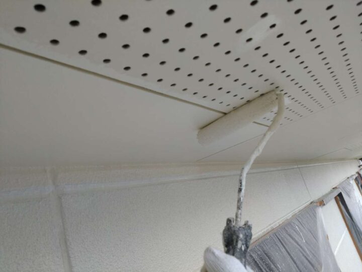 これにより、塗膜が厚くなり、耐久性が向上し、仕上がりが均一で美しい仕上がりになります。【軒天】上塗り