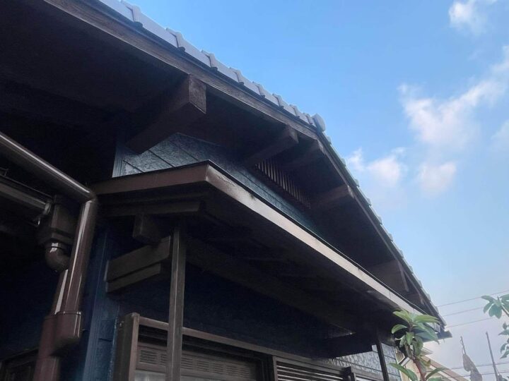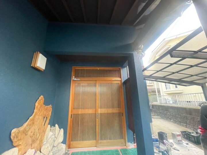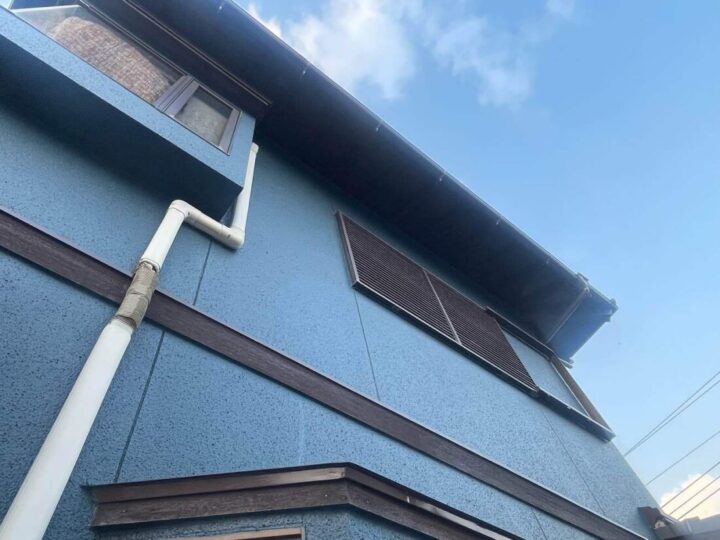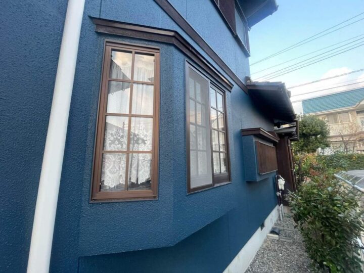 マウンテンブルーの外壁とやララブラウンの付帯部の組み合わせで重厚感ある素敵な仕上がりとなりました。