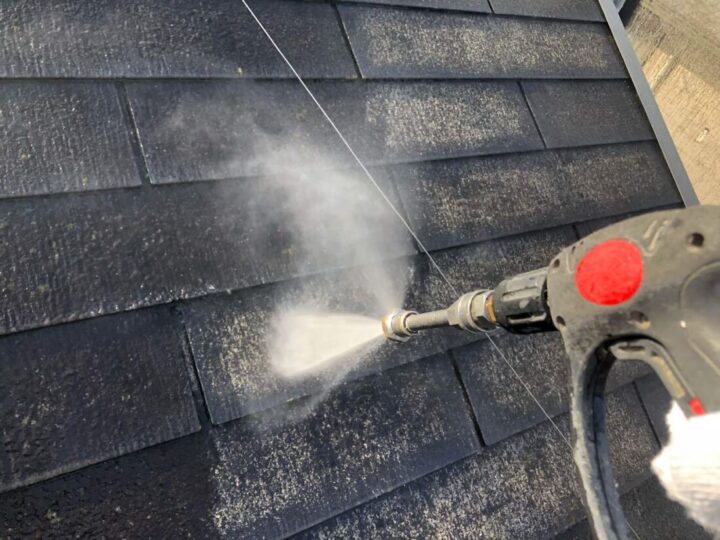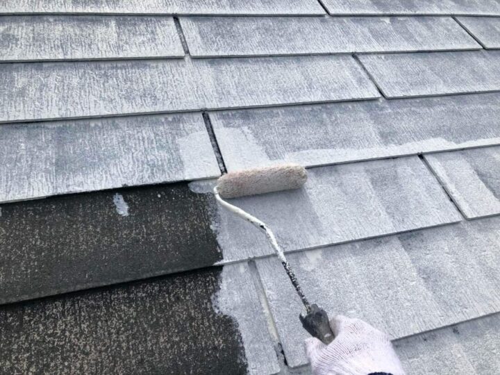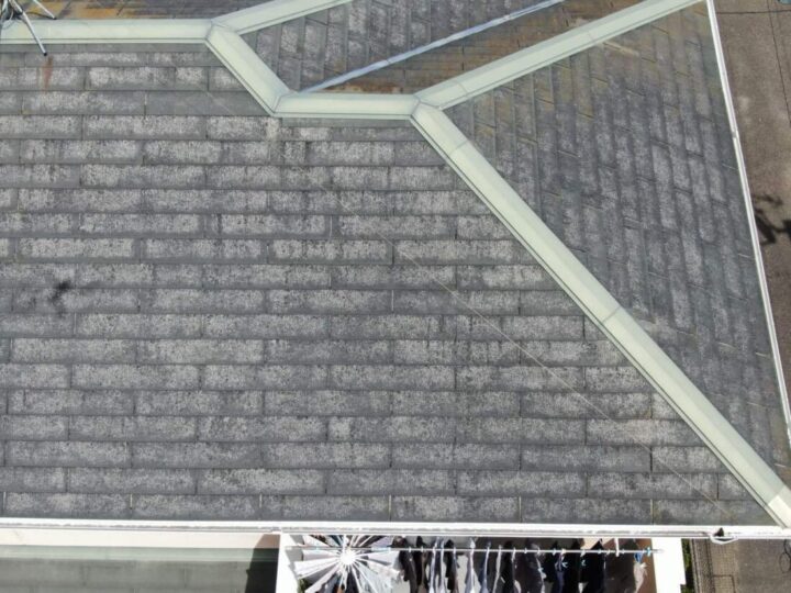 塗装作業に入る前に綺麗に汚れを落として塗装に入ります。【屋根】下塗り